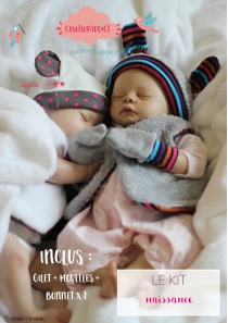 Patron numérique comprenant un gilet de berger, des moufles et un bonnet à oreilles (rondes ou de lapin, les 2 gabarits sont inclus) taille unique "naissance/1 mois".